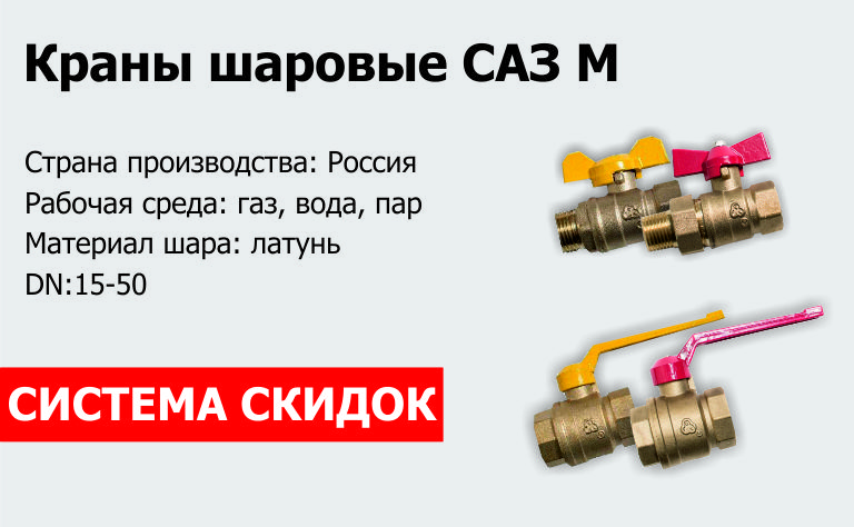 При заказе кранов шаровых латунных САЗ М 11б27п1 на воду, 11б27п на газ и САЗ 11б27п21 на газ под манометр действует система скидок: